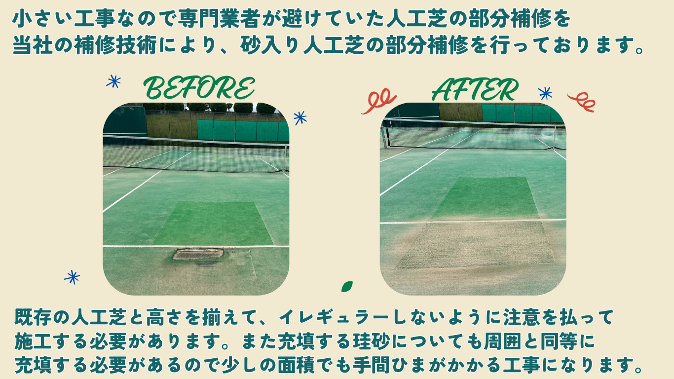 初めのうちは小さい損傷でも、度重なる使用によってどんどん損傷が大きくなり、放置すれば部分補修では手に負えず、人工芝の全面張り替えが必要になる場合もあります。またテニスコートの部分補修は専門業者でも避けることが多いのが現状です。