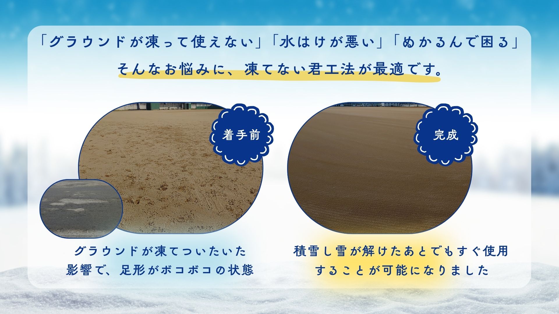 冬季のグラウンド凍結対策をお考えなら、短工期・高耐久の“凍てない君” にお任せください。