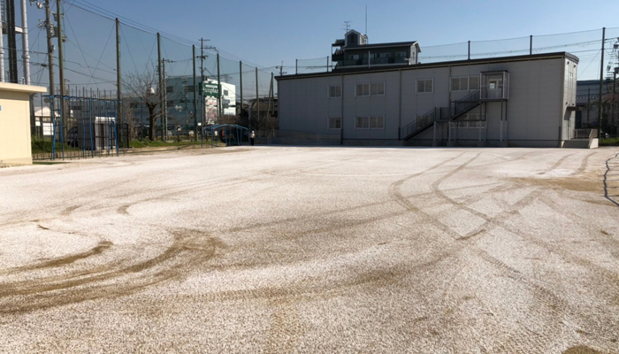施工現場は建築工事の際に、建設資材置き場として使用していたグラウンドを復旧する工事です。資材置き場として使用した後のグラウンドは表面が荒れはて、我々のような専門業者でないと完全復旧するのは非常に困難です。
